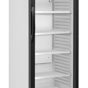 De SCU-serie flessenkoelers biedt veel display- en opslagruimte. Leverbaar in verschillende maten, met of zonder kap. Het is een witte kast met een zwarte glazen deur met aluminium frame, verstelbare legegrs en ledverlichting binnenin voor een optimale presentatie. Ventilatorkoeling zorgt voor een gelijkmatige koeling van de hele kast.