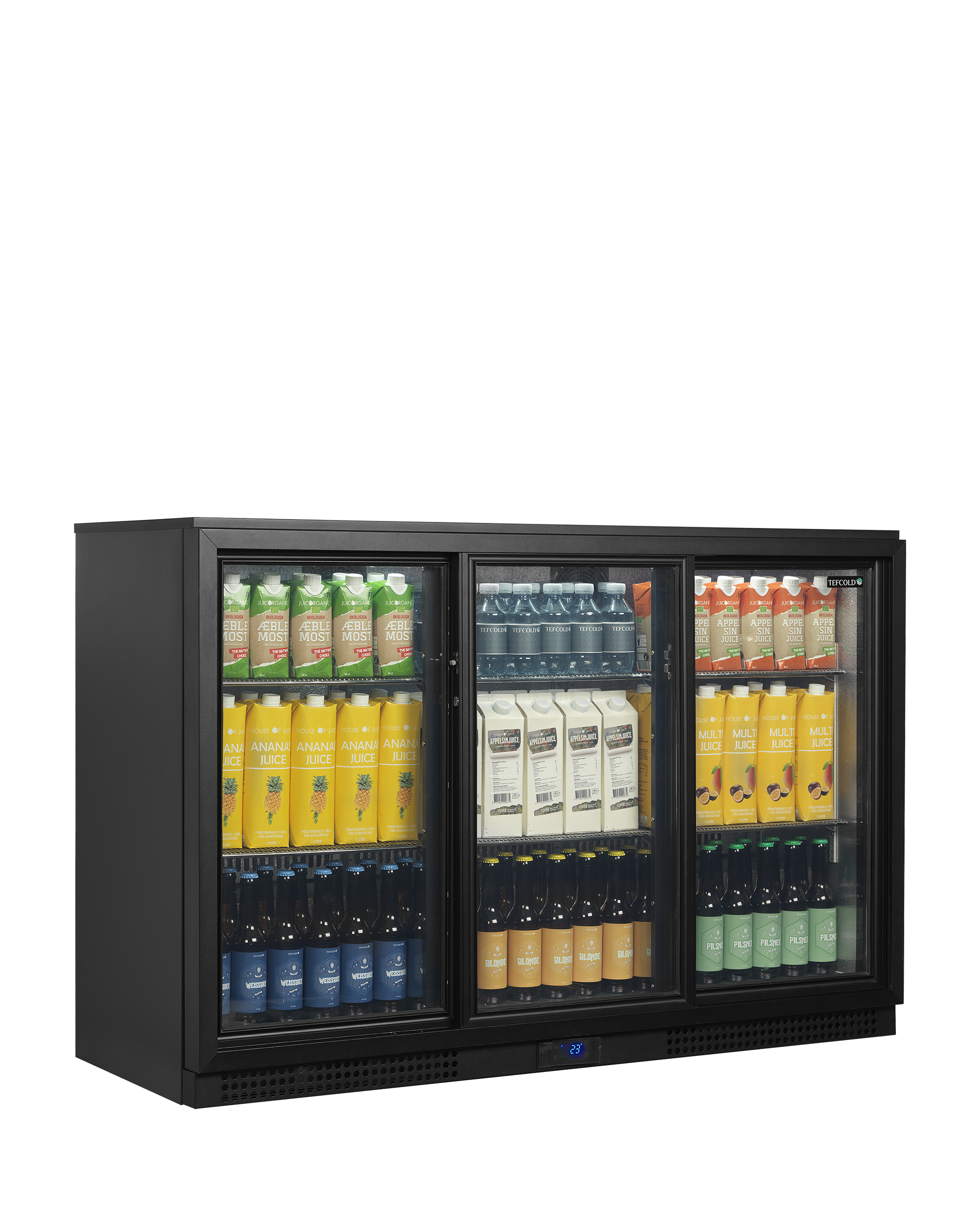 De DB-serie backbars wordt geleverd met 1, 2 of 3 deuren met dubbel gehard glas. Kies tussen schuifdeuren of draaideuren. De backbar heeft een zwarte buitenzijde, een stucco aluminium interieur en wit geplastificeerde draadplanken voor eenvoudig onderhoud. Met geventileerde koeling, eenvoudig te regelen met een elektronische thermostaat. Ideaal voor drukke baromgevingen.
