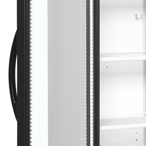 De SCU-serie flessenkoelers biedt veel display- en opslagruimte. Leverbaar in verschillende maten, met of zonder kap. Het is een witte kast met een zwarte omkeerbare glazen deur met aluminium frame, verstelbare planken en ledverlichting binnenin voor een optimale productpresentatie. Een koelsysteem met ventilator zorgt voor een gelijkmatige koeling van de hele kast.