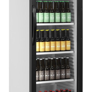 De SCU-serie flessenkoelers biedt veel display- en opslagruimte. Leverbaar in verschillende maten, met of zonder kap. Het is een witte kast met een zwarte omkeerbare glazen deur met aluminium frame, verstelbare planken en ledverlichting binnenin voor een optimale productpresentatie. Een koelsysteem met ventilator zorgt voor een gelijkmatige koeling van de hele kast.