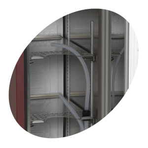De DB-serie backbars wordt geleverd met 1, 2 of 3 deuren met dubbel gehard glas. Kies tussen schuifdeuren of draaideuren. De backbar heeft een zwarte buitenzijde, een stucco aluminium interieur en wit geplastificeerde draadplanken voor eenvoudig onderhoud. Met geventileerde koeling, eenvoudig te regelen met een elektronische thermostaat. Ideaal voor drukke baromgevingen.