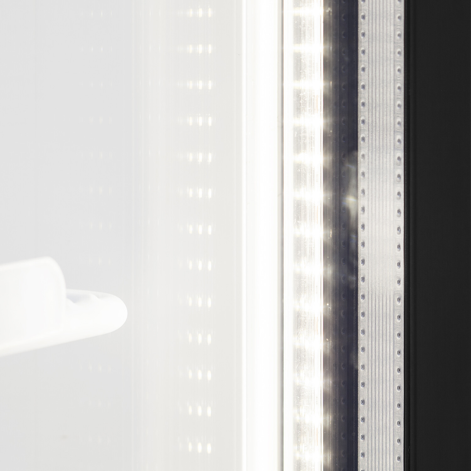 De SCU-serie flessenkoelers biedt veel display- en opslagruimte. Leverbaar in verschillende maten, met of zonder kap. Het is een witte kast met een zwarte omkeerbare glazen deur met aluminium frame, verstelbare planken en ledverlichting binnenin voor een optimale productpresentatie. Een koelsysteem met ventilator zorgt voor een gelijkmatige koeling van de hele kast.