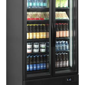 De FSC BLACK-serie zwarte displaykoelers met 2 deuren met een verlichte kap biedt een uitstekende ontwerpkwaliteit tegen een concurrerende prijs. Het heeft een eigentijdse uitstraling met een zwart interieur en een zwarte buitenkant met zwarte glazen deuren met aluminium frame. De planken zijn verstelbaar, waardoor de FSC-serie een flexibele oplossing is. Dit zorgt voor een geweldige productpresentatie in combinatie met een krachtig geventileerd koelsysteem dat wordt geregeld door een elektronische thermostaat. Veel modellen zijn ook verkrijgbaar zonder kap (FS-serie).