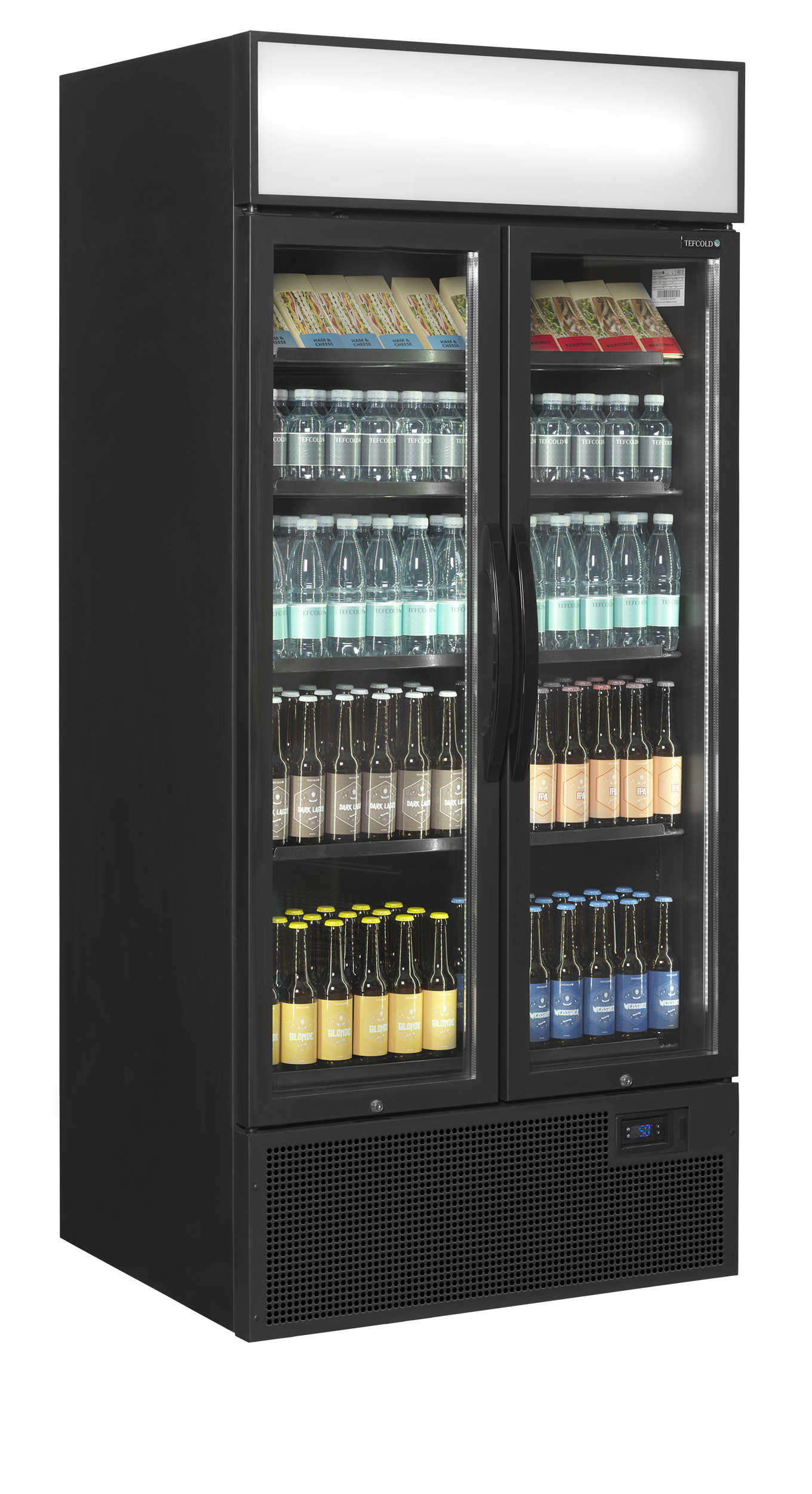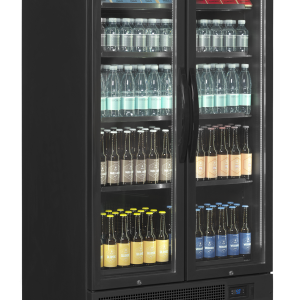 De FS BLACK-serie zwarte displaykoelers met 2 deuren biedt een uitstekende ontwerpkwaliteit tegen een concurrerende prijs. Het heeft een eigentijdse uitstraling met een zwart interieur en een zwarte buitenkant met zwarte glazen deuren met aluminium frame. De planken zijn verstelbaar, waardoor de FS-serie een flexibele oplossing is. Dit zorgt voor een geweldige productpresentatie in combinatie met een krachtig geventileerd koelsysteem dat wordt geregeld door een elektronische thermostaat. Veel modellen zijn ook verkrijgbaar met kap (FSC-serie).