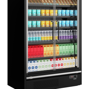 De FS BLACK-serie zwarte displaykoelers met 2 deuren biedt een uitstekende ontwerpkwaliteit tegen een concurrerende prijs. Het heeft een eigentijdse uitstraling met een zwart interieur en een zwarte buitenkant met zwarte glazen deuren met aluminium frame. De planken zijn verstelbaar, waardoor de FS-serie een flexibele oplossing is. Dit zorgt voor een geweldige productpresentatie in combinatie met een krachtig geventileerd koelsysteem dat wordt geregeld door een elektronische thermostaat. Veel modellen zijn ook verkrijgbaar met kap (FSC-serie).