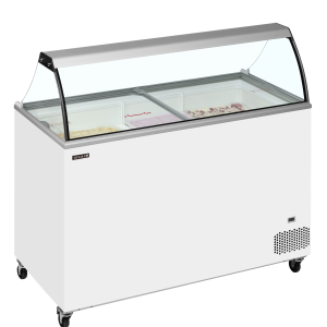 De Isabella-serie is een ruime schepijskast met optie voor 10 of 13 bakken. Het gebogen glasontwerp zorgt voor een oogstrelend plaatje dat uw klanten zeker zal bekoren en het serveerplateau erachter helpt bij een snelle service. Met de ingebouwde gekoelde onderopslag kunt u, als het druk is, de vitrine gemakkelijk aanvullen met vers ijs zonder het ijs uit de kast te halen. Bovendien is de kast voorzien van zwenkwieltjes voor eenvoudige manoeuvreerbaarheid en een interne LED-lamp zodat uw gelato of ijs optimaal wordt gepresenteerd.