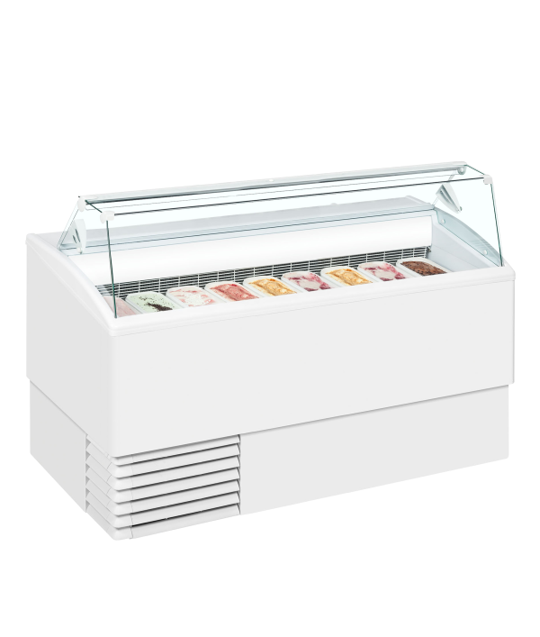De Mirabella-serie schepijsvriezers is een sprong voorwaarts in design en productpresentatie. De schepijsvriezers presenteren het ijs hoog, zodat het van een afstand beter te zien is en klanten aantrekt en zijn uiteraard geschikt voor Napoli-bakken (niet inbegrepen), en onder het uitgestalde ijs is er een opbergvak voor het gemakkelijk bijvullen van het meest verkochte ijs.