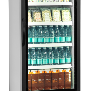 De FSC-serie flessenkoelers met 1 deur biedt een uitstekende ontwerpkwaliteit tegen een concurrerende prijs. De kast is wit met een grijze glazen deur met aluminium frame. Ideaal voor branding en de verlichte kap bovenaan trekt zeker de aandacht van de klanten. Dit zorgt voor een geweldige productpresentatie in combinatie met een krachtig door ventilator ondersteund koelsysteem, en de verstelbare planken zorgen voor extra flexibiliteit. Veel modellen zijn ook verkrijgbaar zonder kap (FS-serie).