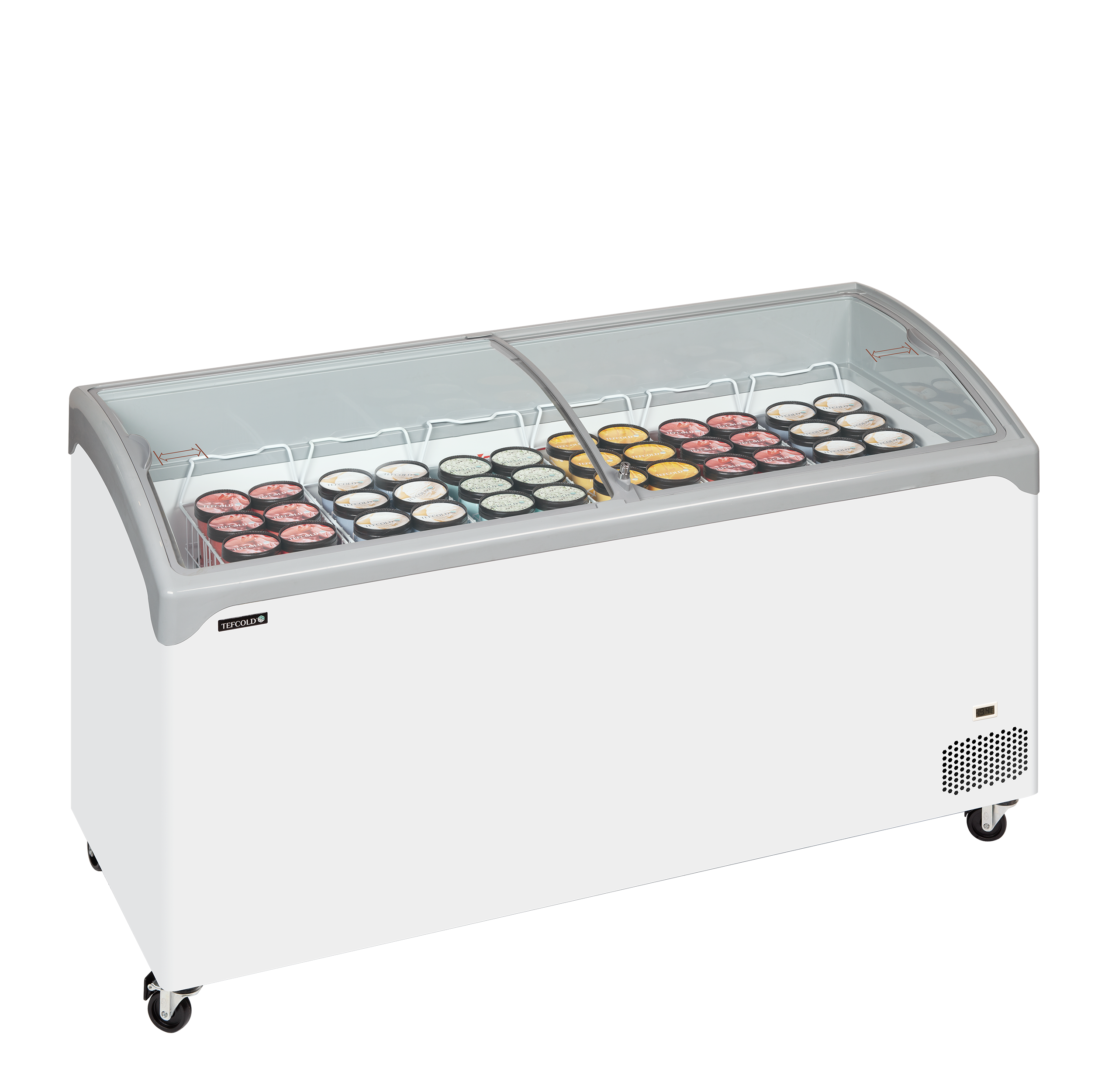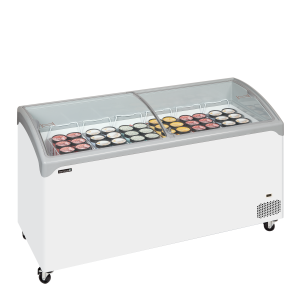 De NIC-serie premium consumptie-ijsvriezers heeft een prachtig ontwerp met gebogen hoeken, afgeronde randen en platte glazen schuifdeksels. Ze zijn stabiel en robuust, maar hebben wel wieltjes voor een gemakkelijke verplaatsbaarheid in de winkel. De vriezer is geweldig voor het presenteren van diepvriesproducten zoals ijs en ijslolly’s. Inclusief een complete set manden.