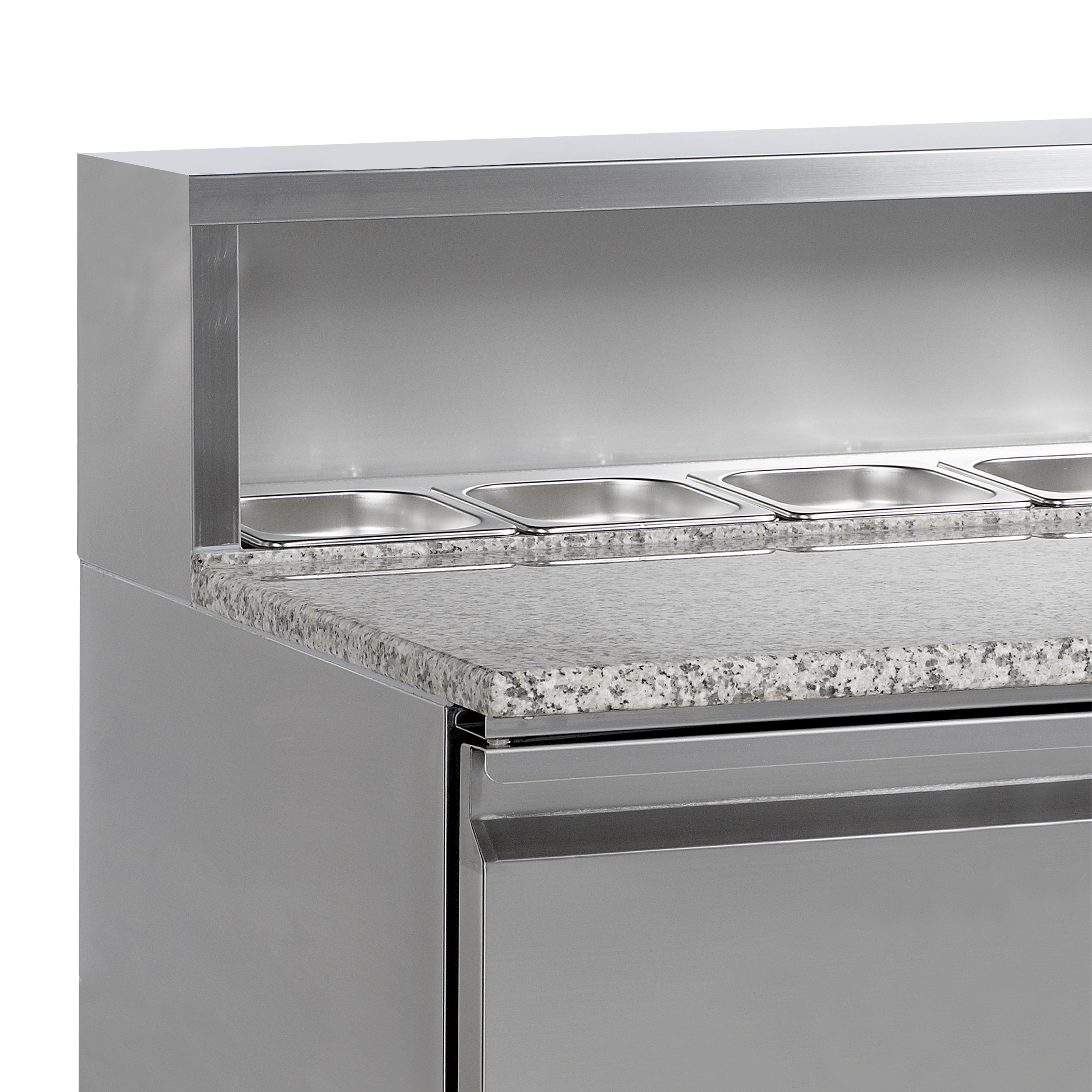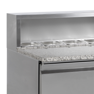 Voordelige G-line pizzacounter met granieten werkblad. Ideaal voor het maken van pizza's, omdat het granieten werkblad koel blijft en het deeg minder snel aan het werkblad blijft plakken. De counter is geschikt voor GN-bakken in maat 1/6 en de kasten hebben GN1/1-afmetingen.