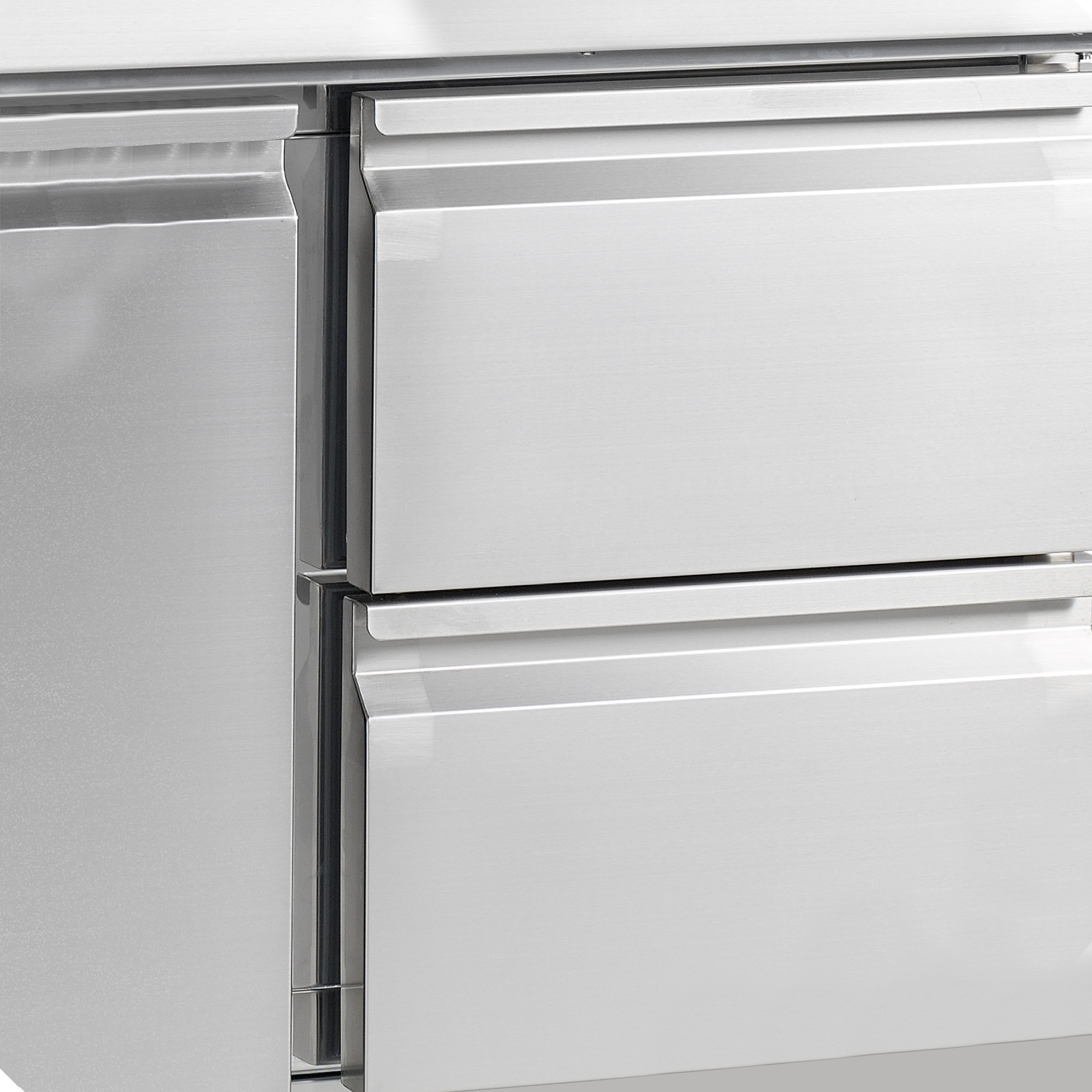 De SS-serie counters voor broodjesbereiding zijn gemaakt van roestvast staal SS304 en is een uitstekende keuze voor professionele keukens. U hebt hier alles wat u nodig hebt, onder handbereik. De koelbak is geschikt voor GN-bakken en de tafels kunnen gemakkelijk worden bijgevuld. De counters zijn leverbaar in diverse afmetingen met 2 of 3 deuren.