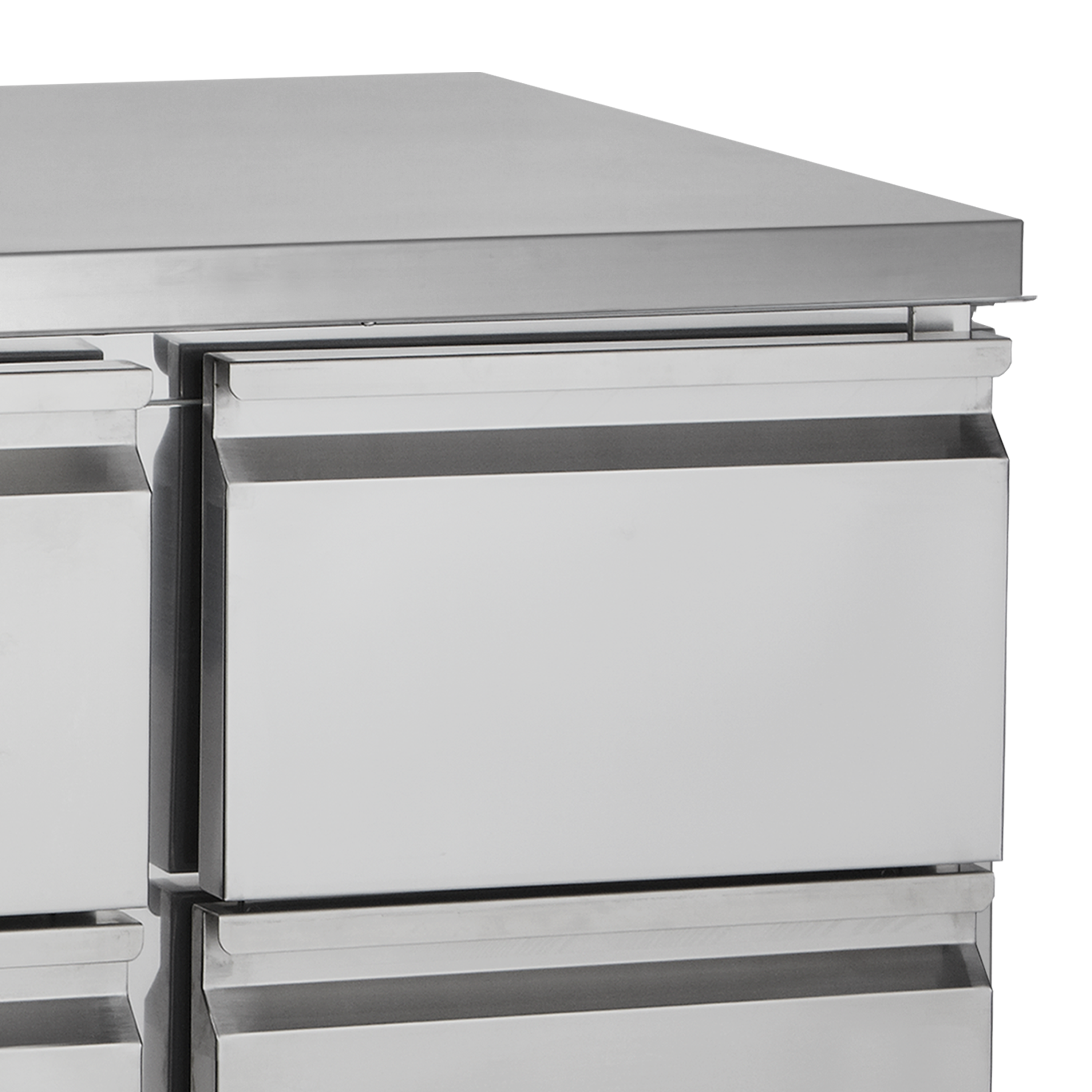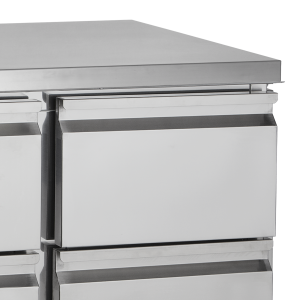 De CK-serie koelwerkbanken van roestvast staal SS304 is gemaakt voor professionele keukens en heeft daarom GN1/1-afmetingen. De toonbanken zijn verkrijgbaar in verschillende maten en u kunt kiezen uit massieve deuren, glazen deuren of lades. Bovendien hebt u de keuze tussen modellen met een afneembaar tafelblad met of zonder opkant. Ze hebben allemaal geventileerde koeling voor een gelijkmatige en constante temperatuur.