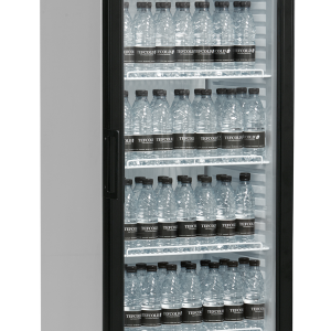 De SCU-serie flessenkoelers biedt veel display- en opslagruimte. Leverbaar in verschillende maten, met of zonder kap. Het is een witte kast met een zwarte omkeerbare glazen deur met aluminium frame, verstelbare planken en ledverlichting binnenin voor een optimale productpresentatie. Een koelsysteem met ventilator zorgt voor een gelijkmatige koeling van de hele kast.
