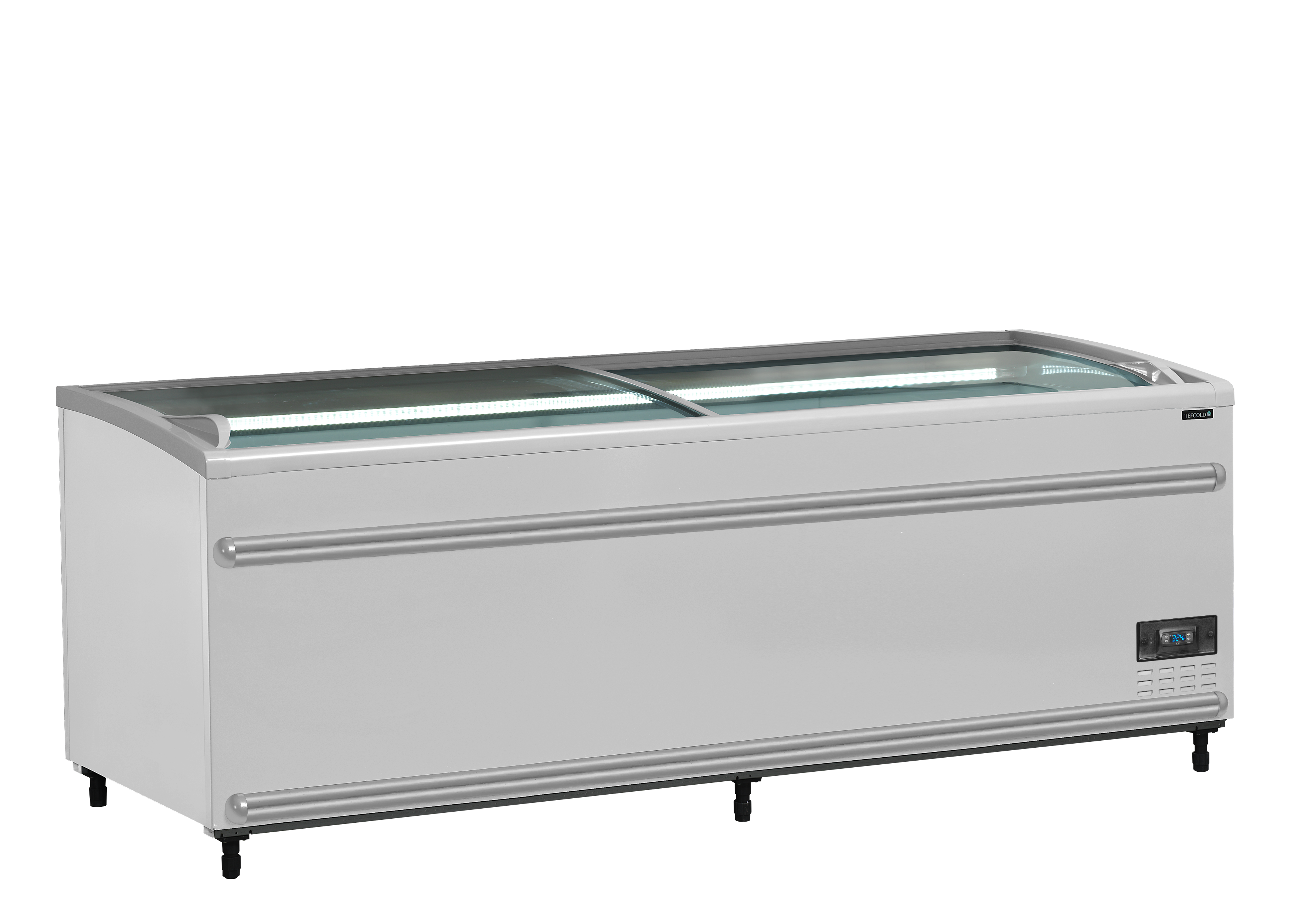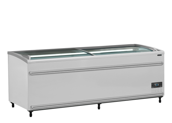 De SFI-CF-serie supermarktkoel-/vrieskisten is verkrijgbaar in diverse kleuren en biedt dankzij de gebogen glazen schuifdeksels goed zicht op de producten binnenin. De inhoud wordt verlicht door ledverlichting op de achterwand van de vriezer. Verstelbare valse bodems tussen de afscheidingen maken het mogelijk de hoogte van de bodem in de kast te verhogen, zodat deze er altijd volledig gevuld uitziet. Perfect voor supermarkten, kruidenierswinkels, slagers enz.