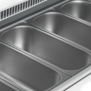 De UDRS-serie schepijsvriezers maakt deel uit van het premium diepvriesprogramma van TEFCOLD. Het biedt hoge kwaliteit en een elegant ontwerp met een lagere voorkant, waardoor het consumptie-ijs goed zichtbaar is. De vriezer heeft glazen schuifdeksels, die helpen isoleren en energie besparen, wanneer u geen ijs serveert over de schuine glazen afscherming. Uiteraard geschikt voor Napoli-bakken (niet inbegrepen).