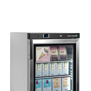 De UF-VG-serie displayvriezers is de geventileerde versie van onze witte vriezers met glazen deur. Hij is verkrijgbaar in verschillende maten. Het geventileerd koelsysteem zorgt voor een gelijkmatige temperatuur in de hele kast. De temperatuur kan worden ingesteld op een gebruiksvriendelijk digitaal thermostaatdisplay.