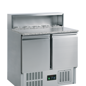 Voordelige G-line pizzacounter met granieten werkblad. Ideaal voor het maken van pizza's, omdat het granieten werkblad koel blijft en het deeg minder snel aan het werkblad blijft plakken. De counter is geschikt voor GN-bakken in maat 1/6 en de kasten hebben GN1/1-afmetingen.